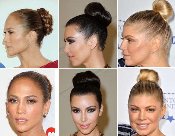 Jennifer Lopez, Kim Kardashian Fergie optaram por cabelos bem puxados na frente. O coque trança de Jennifer Lopez é fácil, porém, bem elaborado. O coque de Kim Kardashian é do tipo donut e precisa ser feito com uma espuma e bastante laque. Coques bem altos, no estilo de Fergie, são bem modernos e boas apostas para balada, festas de fim de ano e jantares chiques.